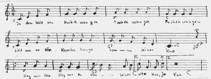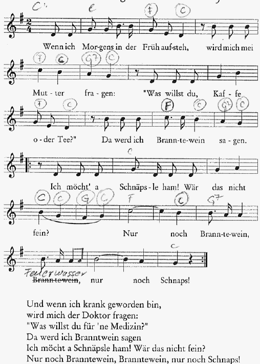 Fidira fidira mei Alter der säuft aa hei jupheidi und jupheida; Schnaps ist guat für die alte Fraa; jupheidi und jupheida; Schubkarrnsrad ist krumm.